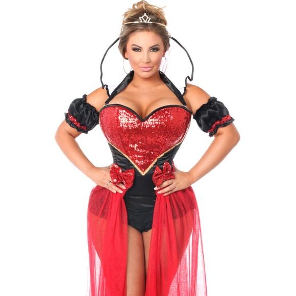 Costume Includes: Full bust corset made of high quality satin and sequin heart embellishment and attached bows Premium YKK side zipper closure10 spiral steel bones with 4 static steel back bones Nickel brass grommets with thick cording in the back for cinching Removable Garters.