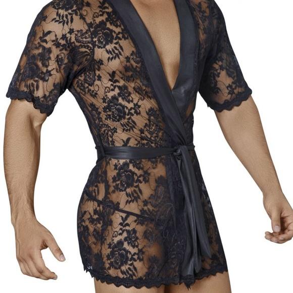 Comfort meets Sexy with this Lace Kimono! Short lace robe with satin collar and belt comes with Matching G-String.