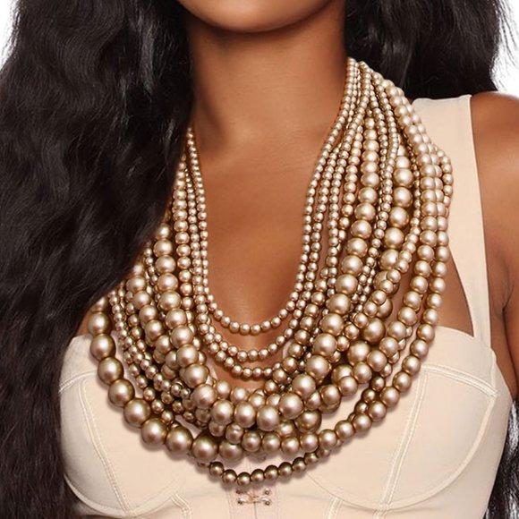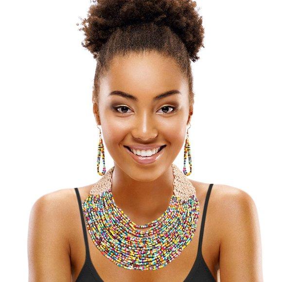 Shop ThisAfrocentric Tribal Neutral Leather Cord Woven Collar Necklace Set Featuring Multi Strand Layered Multi Color Seed Bead Detail. Necklace measures approx 2 inches wide.